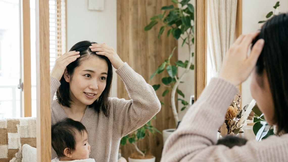 出産による「女性ホルモンの激減」が原因。特に前髪付近はホルモンの影響を受けやすく、真っ先にダメージを受けます。 「放置」は禁物。 産後の頭皮は「砂漠」と同じです。栄養が枯渇した土壌をそのままにせず、適切なケアで発毛サイクルを早めることが大切です。